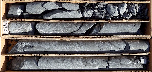 (Figure 1: Core from hole ARC-6A from approximately 1780-1790 feet [542.7-545.7 m]. Upper left is the beginning of the interval and the lower right is the bottom. Core diameter is approximtely 7 cm. Crumbly, broken, decalcified muddy and silty sedimentary rocks thought to belong to the prospective Comus Formation. White veinlets are composed of late-stage calcite.)