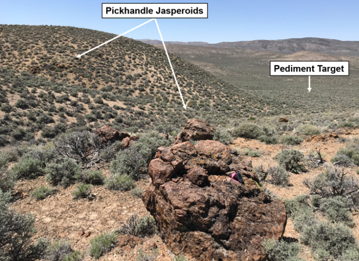 Figure 3: Pickhandle Au-anomalous jasperoids and pediment target (looking northwest).