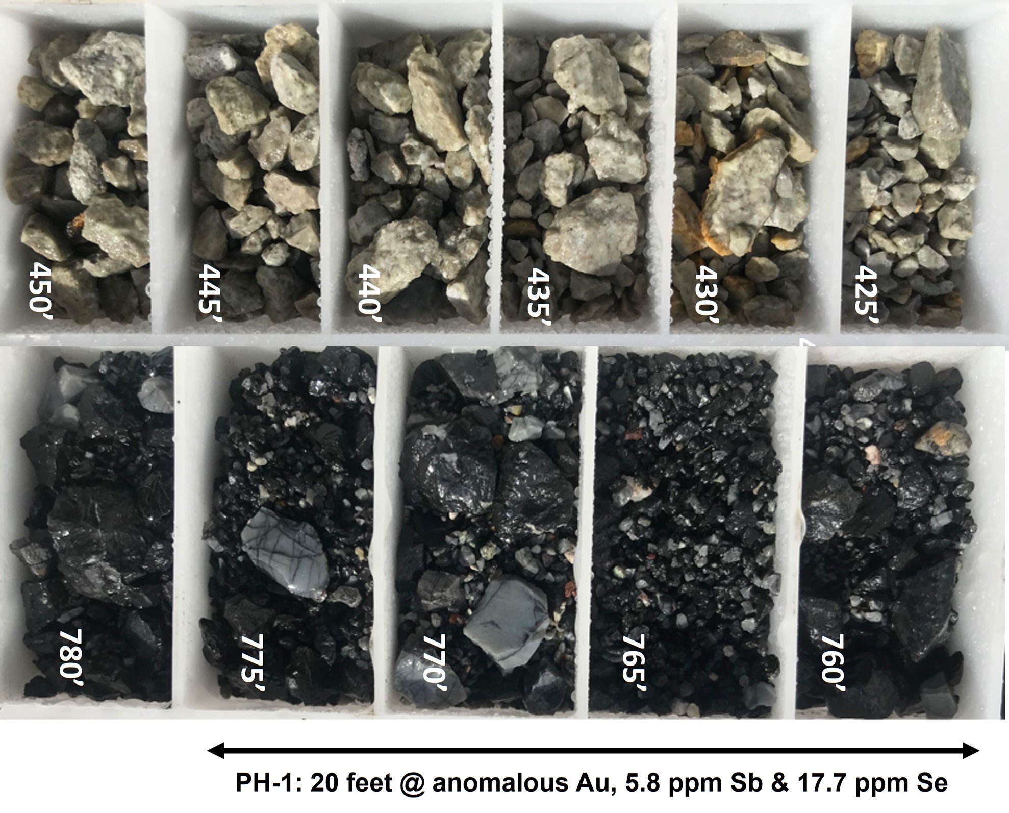 Figure 4: Altered and Au-anomalous dike on top (PH-3) and carbon-rich, Au-anomalous cherty unit with elevated antimony and strong selenium (17.7 ppm) in PH-1.