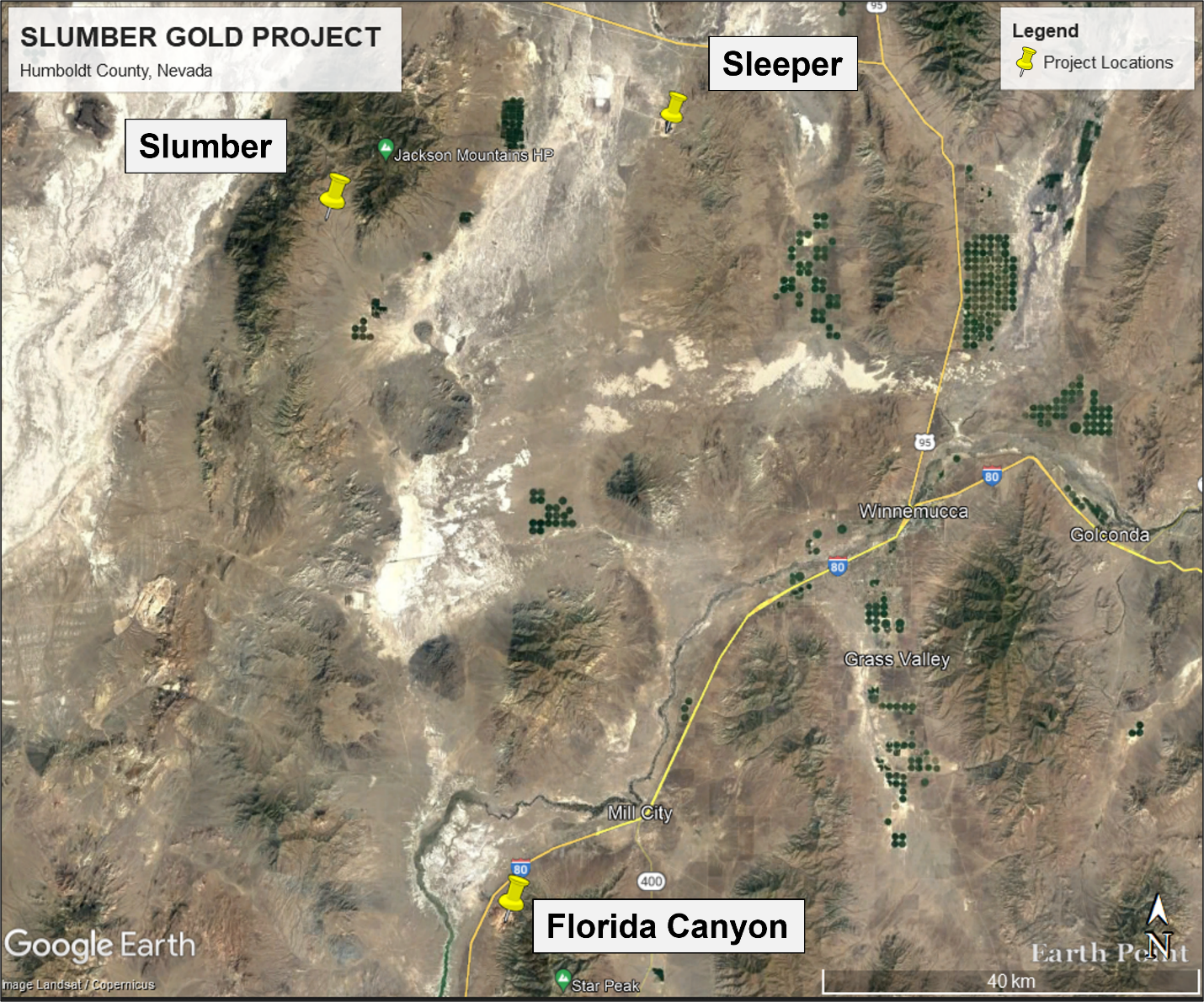 NV Gold’s 100%-owned Slumber Gold Project (“Slumber”) is located approximately 80.5 kilometers (50 miles) northwest of Winnemucca and 35 kilometers (21.7 miles) west of the Sleeper gold deposit, Humboldt County, Nevada, USA (see Figure 1).