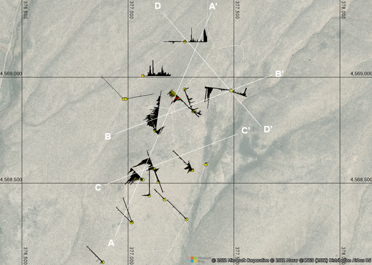 Three drill campaigns have been conducted between August 2019 and early 2022; 29 RC holes (reverse circulation) were completed, totaling 5,200.9 m (17,063.3 ft).