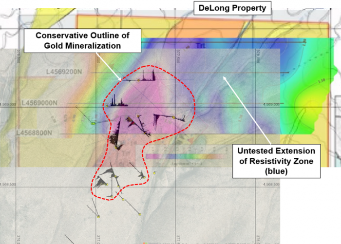 The first two drilling campaigns focused on a “Sleeper-like” model and targeted a small, silicified, and mineralized area in the middle part of the Property. However, the early drilling did not meet the desired high-grade structure but intercepted some zones of low-grade-oxide gold along the northern limits of the drilled area. In 2021 NV Gold did reinterpret this marginal zone of mineralized silicification by using older CSAMT data and a recently conducted IP survey to evaluate a wide-open resistivity zone and its correlation with gold mineralization to the north (see Figure 8 & 9). As a result, most of the 2021-2022 drill holes did meet significant thicknesses of low-grade-oxide gold distributed over an area of 800+ meters by 300+ meters with thicknesses more than 100-150 meters (see figures 3-7). Most holes are bottomed in gold mineralization, depth-limited by ongoing equipment challenges and ground water (see table 1).