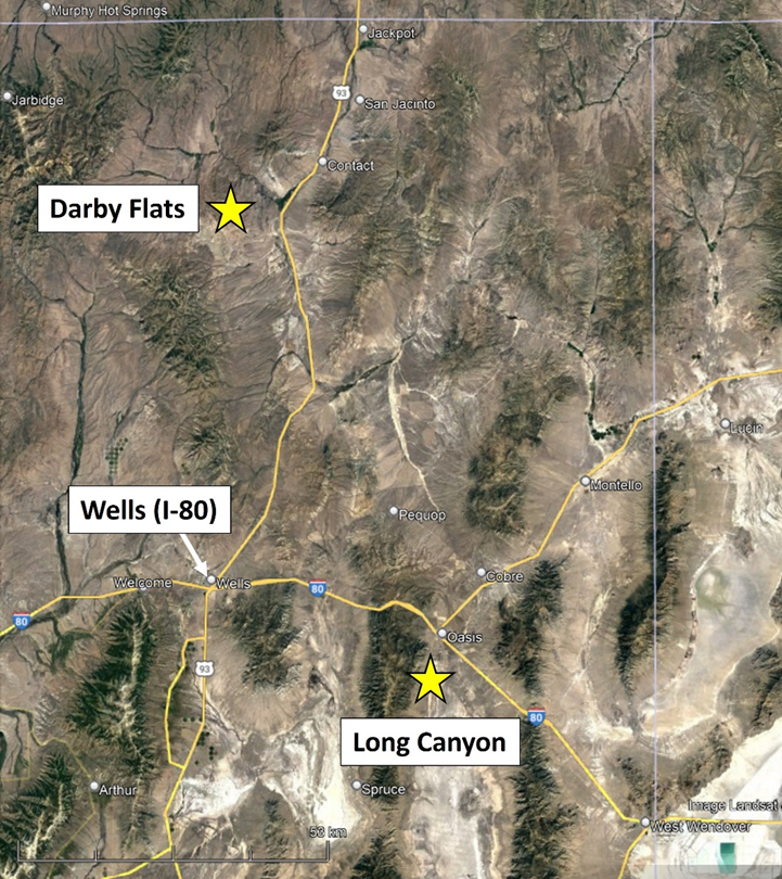 The Darby Flats Gold Project is located in Elko County approximately 65.2 km (40.5 miles) north of Wells in northeastern Nevada (see Figure 1). The Property, comprising 6 unpatented mining claims, is 100%-owned by NV Gold. Limited historical drilling conducted by AngloGold encountered 33.5 meters (110 feet) of anomalous gold and values up to 0.24 g/t Au accompanied by other pathfinder elements (Arsenic to 167 ppm and mercury up to 8.5 ppm). Only two drill holes have tested the Darby Flats target to date!