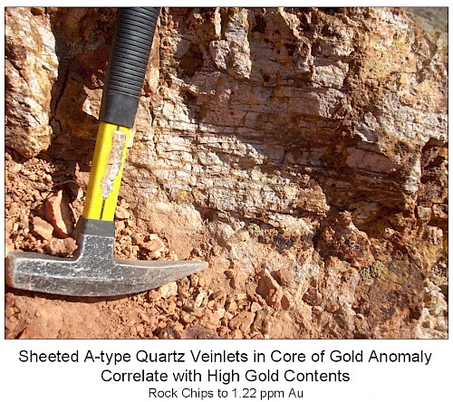 - Mineralization is coincident with potassic alteration, notably hydrothermal biotite-magnetite, and sheeted A-type quartz veinlets
